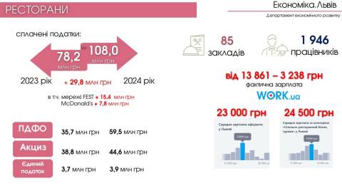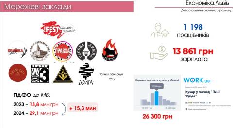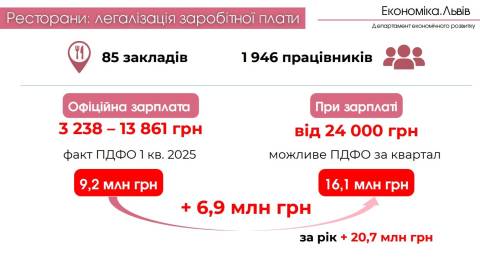 У місті проаналізували 85 ресторанів Львова й з’ясували, що фактична середня заробітна плата одного працівника коливається від 3 238 грн до 13 861 грн, попри те, що середня заробітна плата для цієї галузі становить не менше 24 тис. грн.