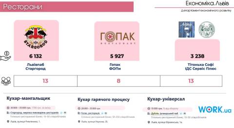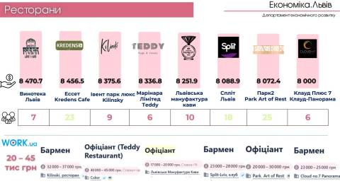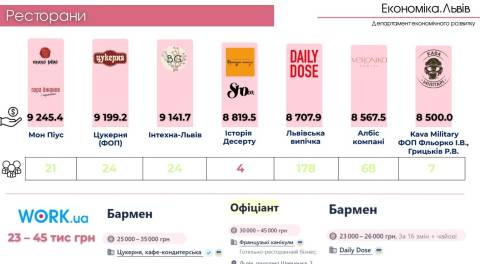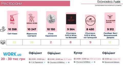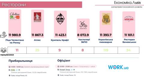 Середня зарплата працівників закладів "Атляс", "Кумпель Крафт", "Ресторан Бачевських", "Королівська пивоварня", "Піца Челентано на Ринку" становить понад 11 тис. грн, а "Світу кави", "Віденської кав’ярні" – понад 10 тис. грн (неофіційно – 20-30 тис. грн).