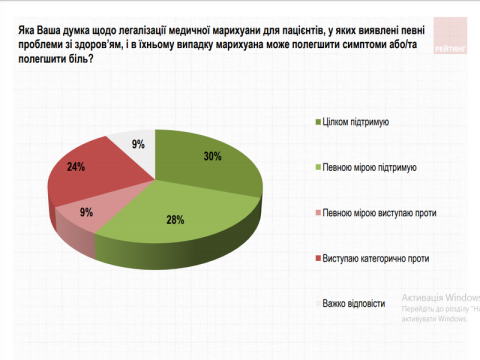 Згідно з результатами опитування, 58% всіх респондентів підтримали легалізацію медичного канабісу в країні: 30% з них цю ініціативу повністю схвалюють, а ще 28% – певною мірою виступають за це нововведення.