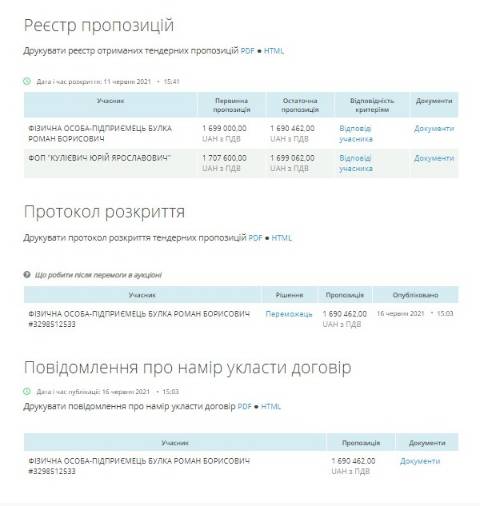Аукціон стартував 11 червня, участь у ньому взяли фізичні особи-підприємці Роман Булка та Юрій Кулієвич, які оцінили свою роботу 1 690 462 грн і 1 699 062 грн відповідно. Переможцем обрали Романа Булку, а очікувана вартість послуг становила 1 707 600 грн.