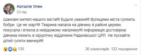 За її словами, на вулицях Радехова виявили бобрів. "Тварина напала на дівчину в районі церкви, покусала і втекла в невідомому напрямку!!! Інформація достовірна: дівчина лежить в хірургічну відділенні Радехівської ЦРЛ. Не пускайте дітей гуляти ввечері!!!", – йдеться у дописі.