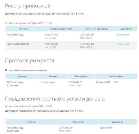 Аукціон стартував 7 травня, участь у ньому взяли дві фірми: ТОВ "Дельтабуд" та ПрАТ "Галгазотерм", які запропонували здійснити усі роботи за 2 570 437,59 грн і 2 579 000 грн відповідно. Переможцем обрали ТОВ "Дельтабуд", а очікувана вартість послуг становила 2 855 975,80 грн.
