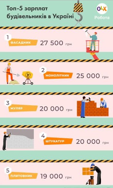 За рейтингом середніх зарплат в сфері, на другому місці за доходом після фасадників опинилися монолітники – 25 000 грн. Хоча попит на них був скромний. А найбільше пропозицій надходило для монтажників. Їх заробіток оцінювали в середньому в 13 500 грн.