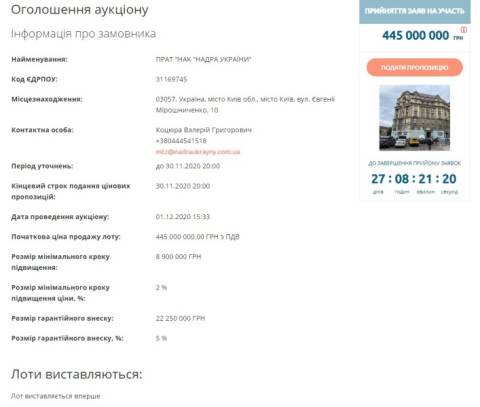Аукціон стартує 1 грудня, а початкова вартість будівлі становить 445 000 000 грн.