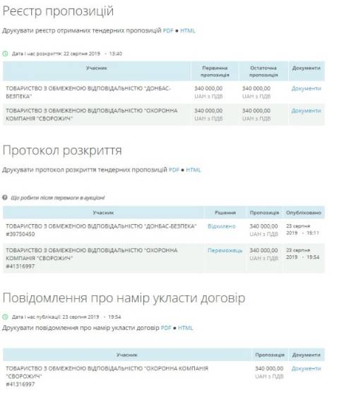 Аукціон стартував 22 серпня, у ньому взяли участь ТзОВ "Донбас-безпека" та ТзОВ "Охоронна компанія "Сворожич", які запропонували по 340 000 грн за свої послуги. Переможцем обрали ТзОВ "Охоронна компанія "Сворожич" через те, що попередня фірма не надала необхідних документів. Додамо, очікувана вартість послуг також становила 340 000 грн.