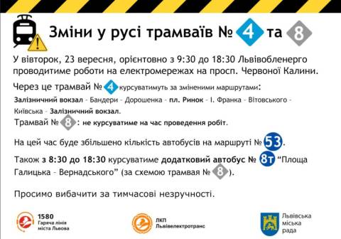 Щоб мінімізувати незручності для пасажирів, у вівторок з 8:30 і до 18:30 за маршрутом трамвая №8 запустять автобус №8т, зі сполученням вул. Вернадського – пл.Галицька. На лінії буде працювати 8 автобусів з інтервалом 12-13 хв.