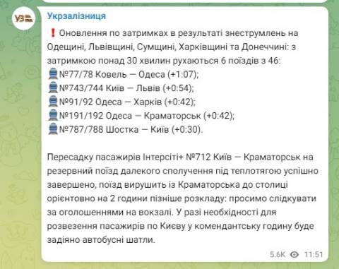 "Пересадку пасажирів Інтерсіті+ №712 Київ – Краматорськ на резервний поїзд далекого сполучення під теплотягою успішно завершено, поїзд вирушить із Краматорська до столиці орієнтовно на 2 години пізніше розкладу: просимо слідкувати за оголошеннями на вокзалі. У разі необхідності для розвезення пасажирів по Києву у комендантську годину буде задіяно автобусні шатли" – йдеться у повідомленні.