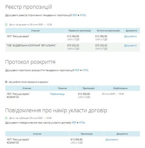 Аукціон стартував 28 січня, участь у ньому взяли ЛКП "Ратуша-сервіс" та ТОВ "Будівельна компанія "Віп-Альянс", які запропонували надати свої послуги за 613 366,88 грн і 670 025 грн відновідно. Переможцем обрали комунальне підприємство, а очікувана вартість послуг становила 681 778,37 грн.
