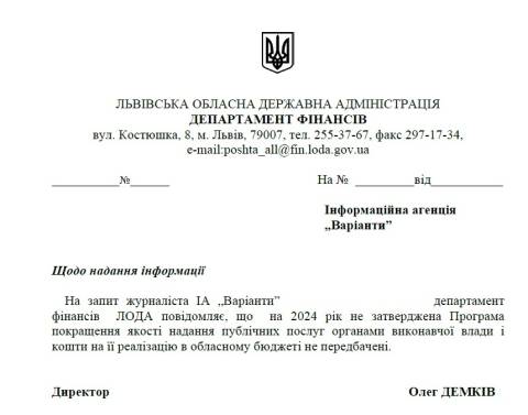 "Департамент фінансів Львівської ОДА повідомляє, що на 2024 рік не затверджена Програма покращення якості надання публічних послуг органами виконавчої влади і кошти на її реалізацію в обласному бюджеті не передбачені" – йдеться у повідомленні.