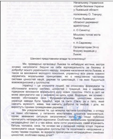 Також Коваль просить Львівську обласну раду, Львівську міську раду, Львівську ОДА, Міністерство культури, МВС, МЗС, Адміністрацію Президента, Верховну раду втрутитися у ситуацію і надати письмові роз’яснення, які дії будуть вжиті для недопущення провокацій і насильства, а також про порядок наших дій у випадку винекнення загрозливої ситуації.