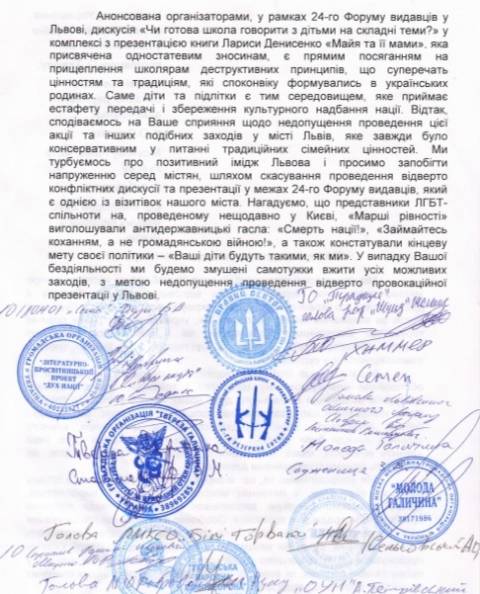 За її словами, ГО "Форум видавців" готується до провокацій і посилює охорону всього заходу, однак минулого тижня на адресу начальника СБУ у Львівській області, міського голови Львова Андрія Садового та голови Львівської ОДА Олега Синютки надійшов лист від зареєстрованих в Україні неформальних громадських організацій із погрозами щодо презентації книги Лариси Денисенко.