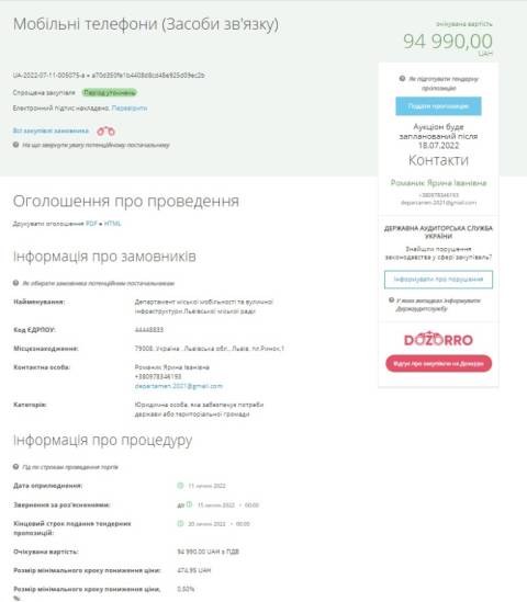 Департамент міської мобільності та вуличної інфраструктури Львівської міської ради оголосив тендер у системі ProZorro на мобільні телефони, які переможець тендеру має поставити до 23 серпня 2022 року.