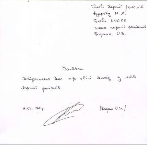 Депутат Львівської облради Олег Баран офіційно повідомив про свій вихід з Партії регіонів.