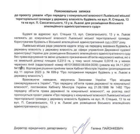 Як пояснила директорка юридичного департаменту Львівської міськради Гелена Пайонкевич, це вже друга така ухвала. Львівська міська рада вперше надала згоду на передачу будівель ще у 2021 році.