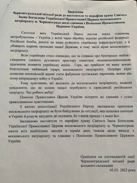 "З метою консолідації Українського Народу закликаємо прихожан московського патріархату не бути байдужими до ситуації, яка склалася сьогодні в Україні й рішуче засудити дії окупанта, бо з нами правда і з нами Бог. Закликаємо настоятеля та парафіян храму святого Івана Богослова Української Православної Церкви московського патріархату м. Червоноград вжити всіх необхідних заходів в термін двох тижнів щодо виходу з московського патріархату та єднання з Помісною Православною Церквою України" – йдеться у тексті звернення.