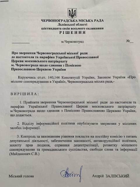 Вчора, 5 травня, під час засідання сесії Червоноградської міської ради депутати підтримали звернення до настоятеля та парафіян Української Православної Церкви московського патріархату Червонограда, в якому закликають його об'єднатися з Православною Церквою України.