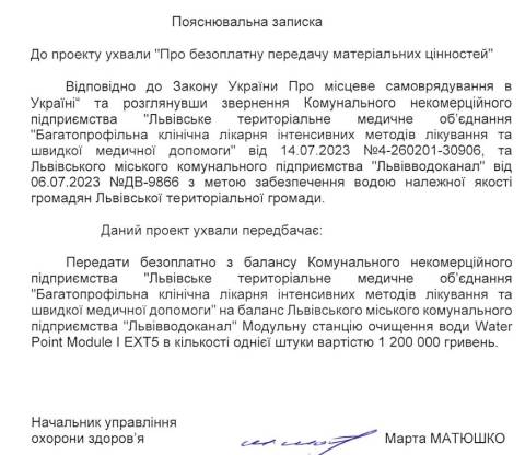 "З метою забезпечення водою належної якості громадян Львівської міської територіальної громади передати безоплатно з балансу КНП "Львівське територіальне медичне об’єднання "Багатопрофільна клінічна лікарня інтенсивних методів лікування та швидкої медичної допомоги" на баланс ЛМКП "Львівводоканал" матеріальні цінності" – йдеться в проєкті ухвали.