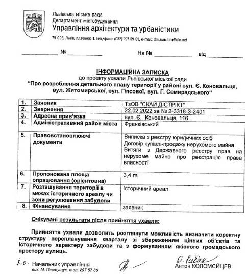 Згідно із документом, з проханням прийняти детальний план території у районі вул. Є. Коновальця, вул. Житомирської, вул. Гіпсової, вул. Г. Семирадського, загальною площею у 3,4 га, щоб мати змогу здійснити перепланування кварталу, до міськради у лютому цього року звернулося ТзОВ "Скай Дістрікс".
