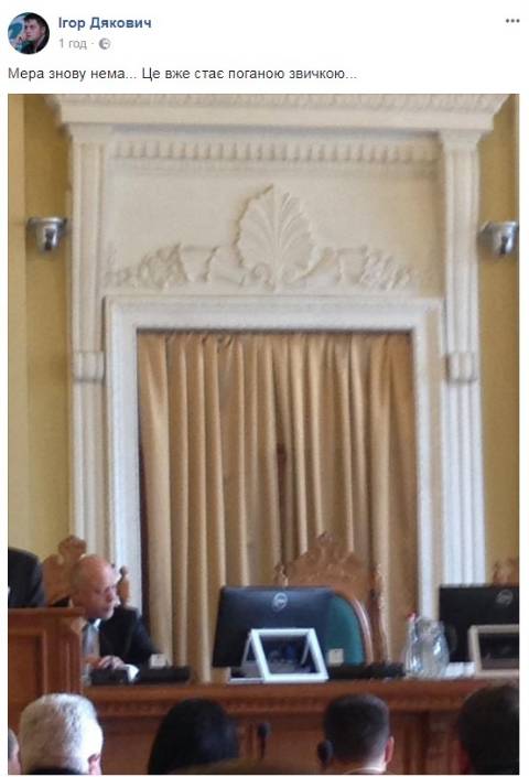 Сьогодні під час сесії Львівської міської ради депутати неодноразово скаржились на те, що міського голови Львова Андрія Садового немає у сесійній залі, коли вони зачитують свої звернення та запити.
