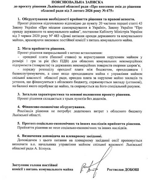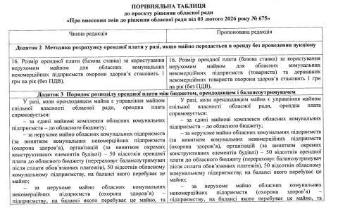 Постійна комісія з питань комунального майна облради 27 березня зареєструвала проєкт рішення, яким встановлються оренда плата для державних некомерційних товариств охорони здоров'я в області.
