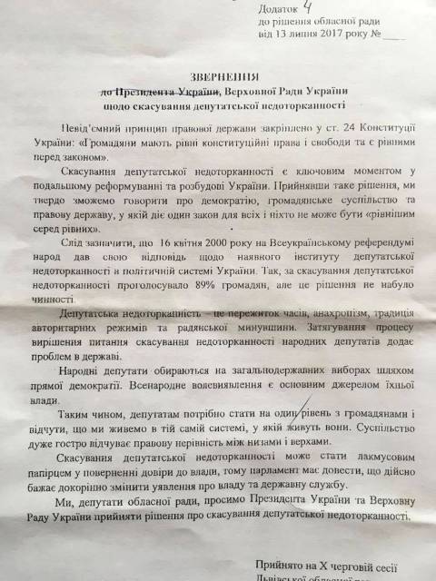 Львівська облрада звертається до Верховної Ради з вимогою скасувати депутатську недоторканність.