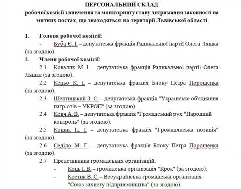 "Доручити робочій комісії, за результатами роботи, подати до Львівської обласної ради свої обґрунтовані висновки та пропозиції щодо ситуації із станом дотримання законності на митних постах, що знаходяться на території Львівської області ", – йдеться у проекті рішення.