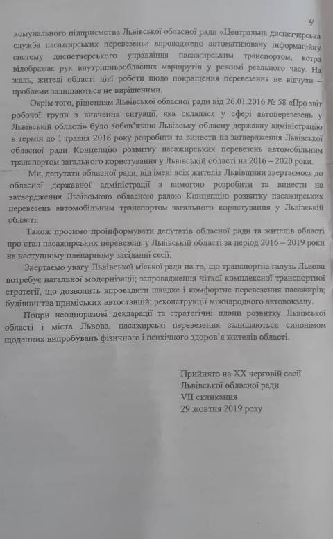"Ми депутати обласної ради, від іменів жителів Львівщини звертаємося до обласної державної адміністрації з вимогою зробити та винести на затвердження Львівською обласною радою Концепцію розвитку пасажирнських перевезень автомобільним транспортом загального користування у Львівській обалсті" –йдеться у зверненні.