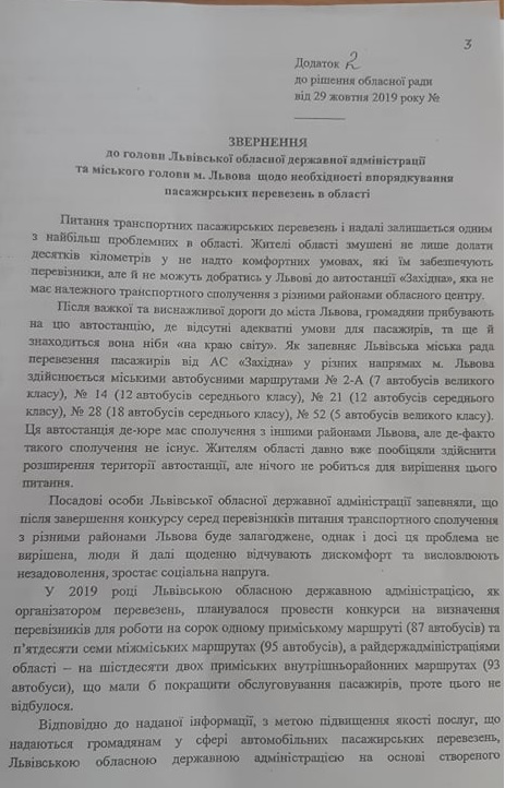 У зверненні депутати зазначили, що жителі області змушені не лише долати десятків кілометрів у не надто комфортних умовах, які їм забезпечують перевізники, але й не можуть добратись у Львові до автостанції "Західна", яка не має належного транспортного сполучення з різними районами обласного центру.