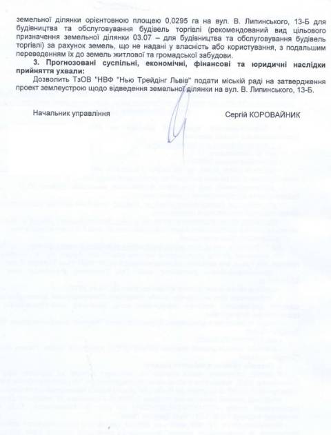 "Надати ТзОВ "Науково-виробнича фірма "Нью-Трейдінг Львів" дозвіл на розроблення проекту землеустрою щодо відведення земельної ділянки орієнтовною площею 0,0295 га на вул. В. Липинського, 13-Б для будівництва та обслуговування будівель торгівлі за рахунок земель, що не надані у власність або користування, з подальшим переведенням їх до земель житлової та громадської забудови" – йдеться в ухвалі.