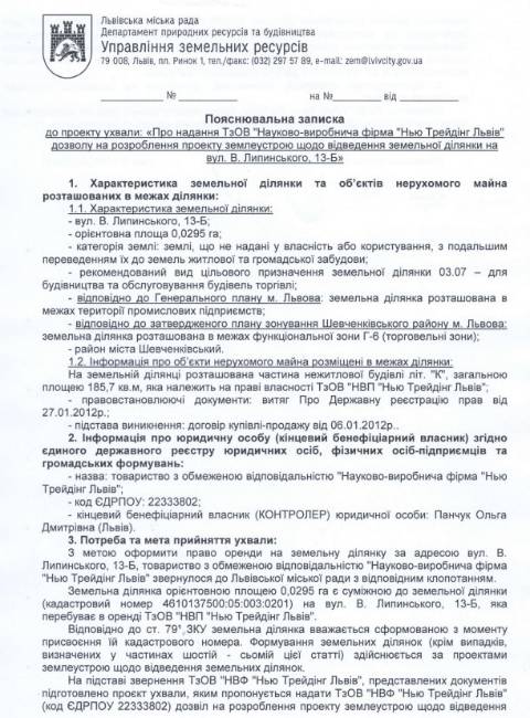 Згідно з документом, йдеться про ділянку площею 0,0295 га на вул. В. Липинського, 13-Б у Шевченківському районі Львова, що перебуває у комунальній власності Львова. На цій ділянці знаходиться нерухомість, площею 185,7 м², що з 2012 року є у приватній власності львівського забудовника ТзОВ "НВК "Нью-Трейдінг Львів" – частина нежитлової будівлі. Фірма планує орендувати у міськради цю земельну ділянку.