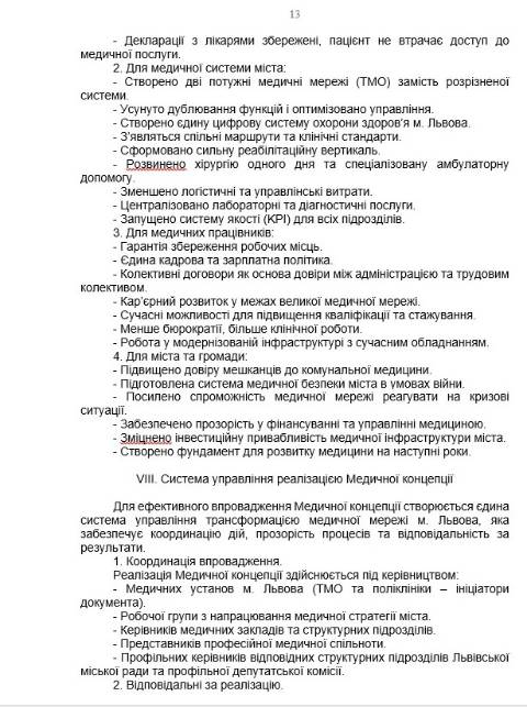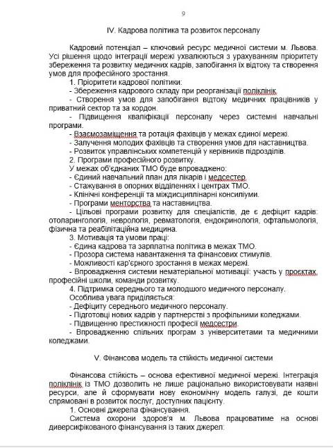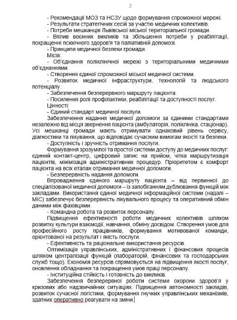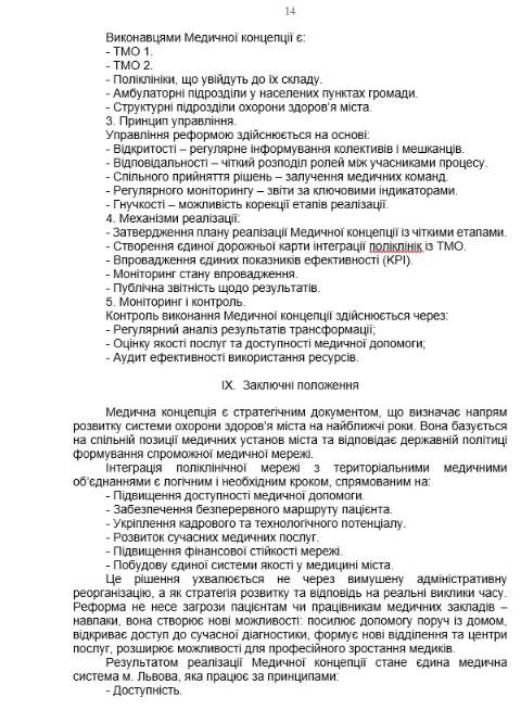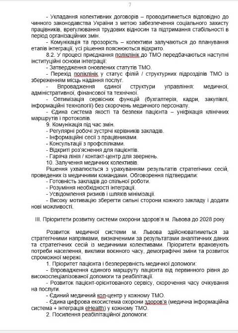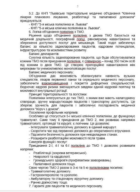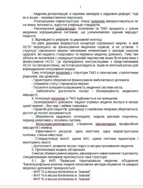 "Прийняття цієї ухвали є стратегічно необхідним рішенням для збереження і розвитку медицини Львова. Інтеграція поліклінік із ТМО не ліквідує первинну допомогу, не позбавляє людей доступу до лікарів і не створює загроз для працівників. Навпаки – це посилення комунальної медицини, підвищення ефективності системи і створення сучасної медичної мережі, яка відповідає потребам мешканців громади і вимогам часу" – йдеться у документі.