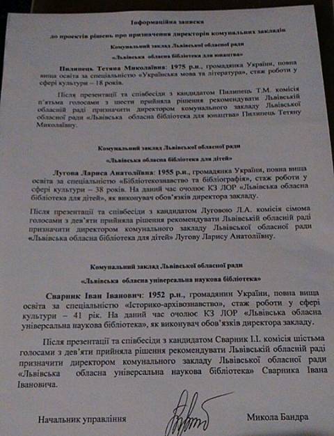 Наразі усі нові керівники обласних бібліотек мають укласти контракти терміном на 5 з управлінням майном спільної власності Львівської облради.