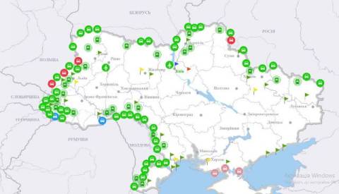 На інтерактивній карті позначені пункти пропуску та різними кольорами стан їх завантаженості на виїзд з України. Вся інформація оновлюється кожні три години.