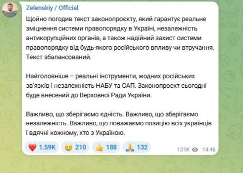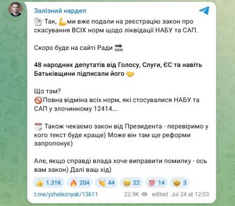 "Ми вже подали на реєстрацію закон про скасування всіх норм щодо ліквідації НАБУ та САП. 48 народних депутатів від Голосу, Слуги, ЄС та навіть Батьківщини підписали його. Що там? Повна відміна всіх норм, які стосувалися НАБУ та САП у злочинному 12414" – заявив народний депутат від голосу Ярослав Железняк у Telegram.
