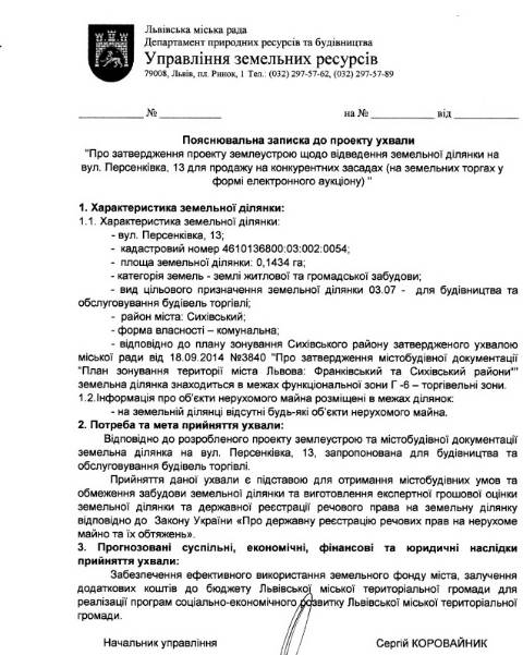 Згідно з документом, йдеться про ділянку площею 0,1434 га, що знаходиться на вул. Персенківці, 13 у Сихівському районі Львова й перебуває у комунальній власності Львова. На цій ділянці відсутні будь-які об’єкти нерухомості.