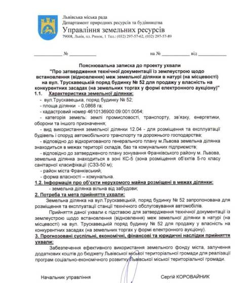 Згідно з документом, йдеться про ділянку площею 0,0868 га, що знаходиться на вул. Трускавецькій (біля будинку № 52) у Франківському районі Львова й перебуває у комунальній власності. На цій ділянці відсутні будь-які об’єкти нерухомості.