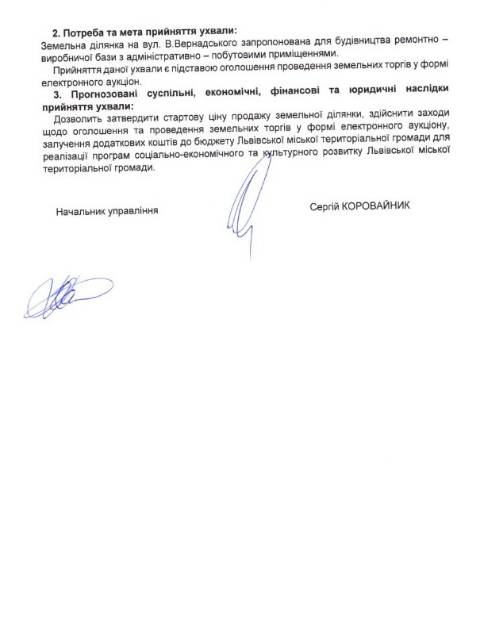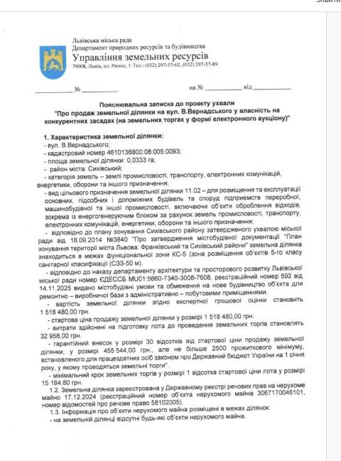 На сайті Львівської міськради оприлюднили проєкт ухвали про продаж земельної ділянки на вул. В. Вернадського у власність на земельних торгах у формі електронного аукціону.