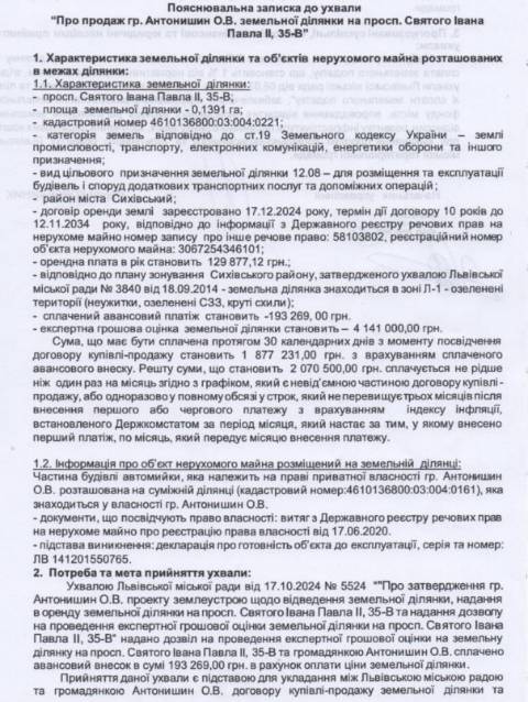 Згідно з документом, земельну ділянку площею 0,1391 га на проспекті Святого Івана Павла ІІ, 35-В, що перебуває у комунальній власності, планують продати Ользі Антонишин, що з грудня 2024 року орендує цю ділянку у міськради Львова за 129 877,12 грн в рік.