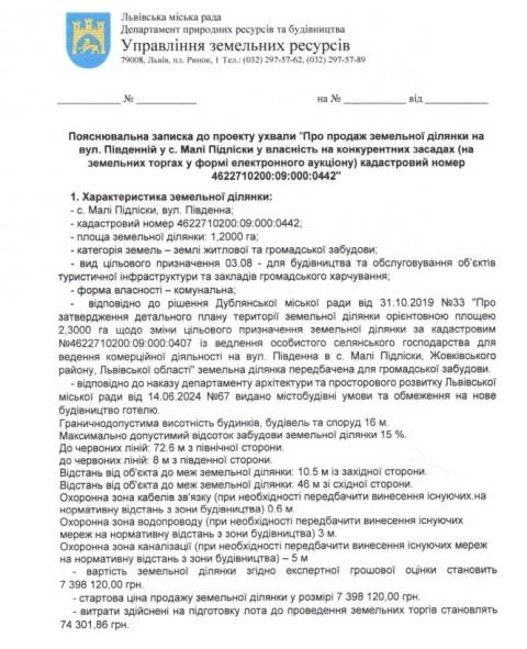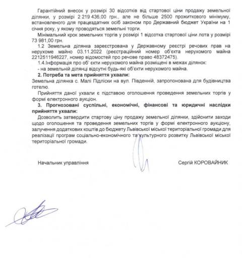 "За результатами земельних торгів продати у власність земельну ділянку площею 1,2 га на вул. Південній у с. Малі Підліски для будівництва готелю (вид цільового призначення земельної ділянки – для будівництва та обслуговування об’єктів туристичної інфраструктури та закладів громадського харчування)" – йдеться в ухвалі.
