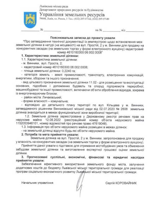 Згідно з документом, йдеться про ділянку площею 0,2240 га, що знаходиться на вул. Простій, 2 у Винниках й перебуває у комунальній власності Львова. На цій ділянці відсутні будь-які об’єкти нерухомості.