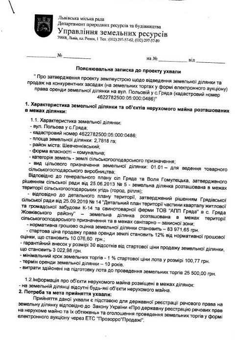 На сайті Львівської міськради оприлюднили проєкт ухвали, якою пропонують здати в оренду земельну ділянку на вул. Польовій у селі Гряда Львівської громади.