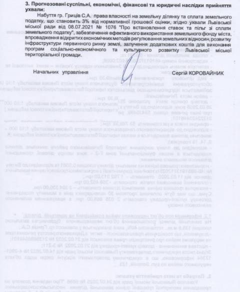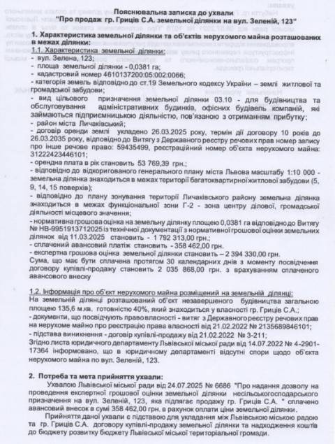 Згідно з документом, земельну ділянку площею 0,0381 га на вул. Зеленій, 123, що перебуває у комунальній власності, планують продати Світлані Гриців, що з березня 2025 року орендує цю ділянку у міськради Львова за 53 769,39 грн в рік.