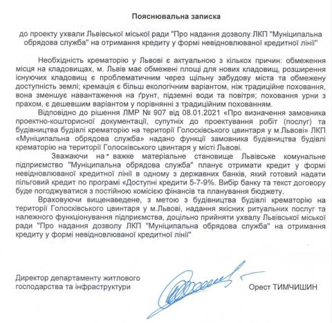 Йдеться про отримання ЛКП "Муніципальна обрядова служба" кредиту у розмірі 60 млн грн. Кошти передбачені для будівництва крематорію на території Голосківського цвинтаря у Львові.