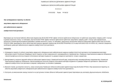 "З метою створення необхідних умов для забезпечення надання комбустіологічної допомоги затвердити перелік та обсяги закупівель медичного обладнання для забезпечення надання комбустіологічної допомоги постраждалим внаслідок військової агресії Російської Федерації проти України на базі комунального некомерційного підприємства "Львівське територіальне медичне об’єднання "Багатопрофільна клінічна лікарня інтенсивних методів лікування та швидкої медичної допомоги" – йдеться у розпорядженні.