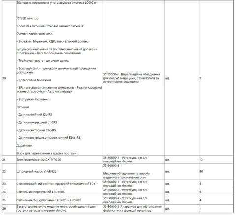 Зокрема, у перелік увійшли 26 найменувань різного медичного обладнання, серед них: апарат штучної вентиляції легень, електрокардіограф, хірургічний столик, апарат для анестезії тощо.