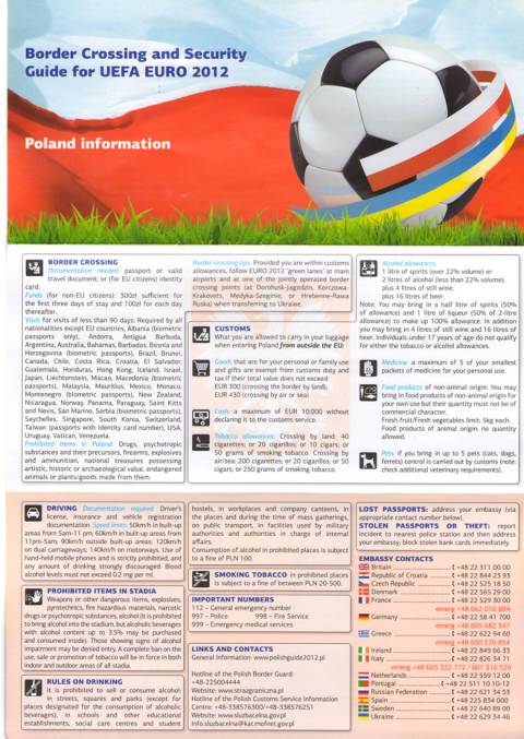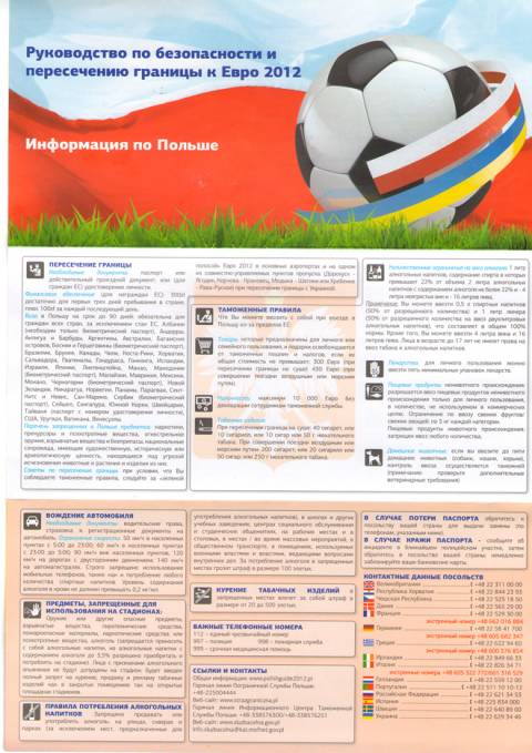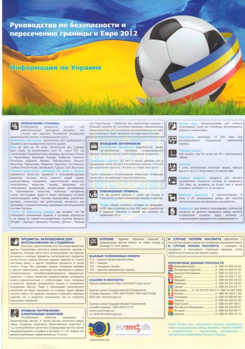 Буклет подає інформацію про митні правила, про предмети, використання яких заборонено на стадіонах, про правила вживання алкогольних напоїв, про ліки, продукти та домашні тварини, які можна ввозити.
