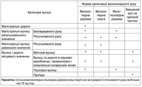 У залежності від категорій вулиць і доріг визначаються відповідні форми організації велосипедного руху в населених пунктах: