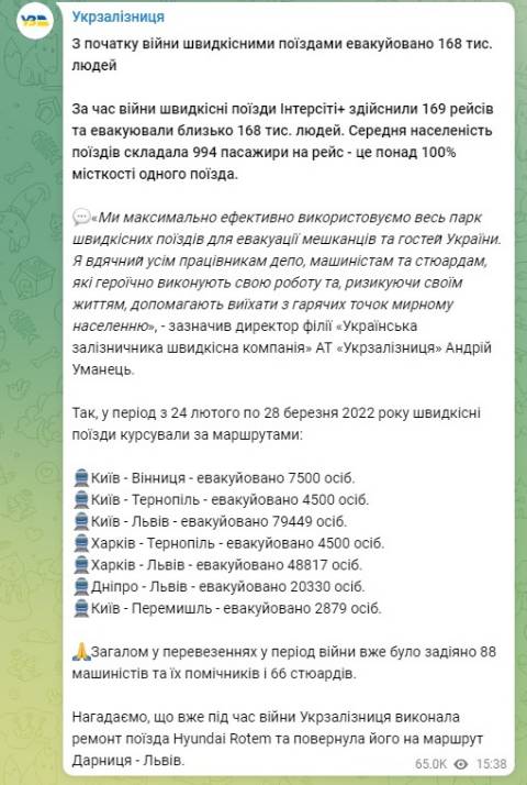Загалом з 24 лютого швидкісні поїзди Інтерсіті+ здійснили 169 рейсів та евакуювали близько 168 тисяч людей. Середня населеність поїздів складала 994 пасажири на рейс – це понад 100% місткості одного поїзда.