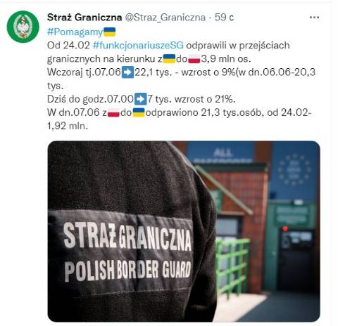 Станом на сьогодні на ранок, починаючи із 24 лютого, початку широкомасштабної війни Росії проти України, до Польщі з України прибуло 3,9 мільйона біженців.