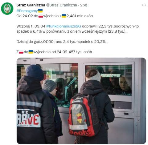Станом на сьогодні на ранок, починаючи із 24 лютого, початку широкомасштабної війни Росії проти України, до Польщі з України прибуло 2,481 мільйона біженців.